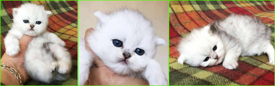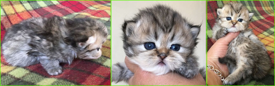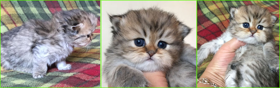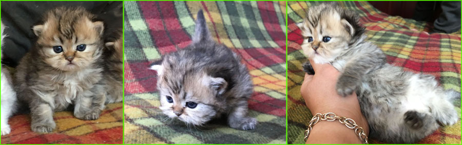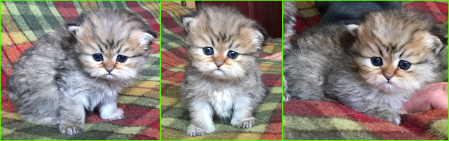 Kittens are taking their first steps, they are 3 weeks and a couple of days old. While chinchillas and goldenchinchillas looks dark when young due to short fur and that tipping is visible first, all will be singificantly lighter coloured as their fur grows and the optical effect changes.
