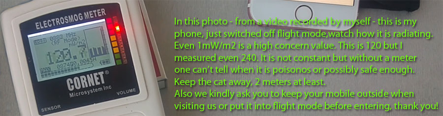 2020 spring's: my first RADIATION WARNING updated in 2024 to avoid repetition- PLEASE READ - during 2020 spring a bunch of healthy kitten suddenly became very sick with proper so called cov.id symptoms (irradiation symptoms to be precise) while no one else in the house were affected, not us, not the rest of the cats, not even their mother being in the same room. What happened was this, I had the bad habit leaving my mobile (I used an Iphone X) on the table in the living room and kittens liked to sleep under the table on the rug, curled together. Distance from the mobile was a meter. First symptoms we noticed were, they looked limp for this or that leg, all of them. They couldn't walk properly and avoided walking while were willing to play with us without moving / running. 2 days later they ALL had sky-high fever. We managed to get an emergency appointment despite of the cov.id-madness. The vet told us, she excluded poisoning, and THERE WAS NO KNOWN CAT ILLNESS LIKE THIS, considering all the symptoms and what she found upon examination were pneumonia, otherwise she was clueless. It was absolutely weird as there was no coughing, no nose or eye discharge, nothing just that limping first then fever and pneumonia later and in ALL of them, at the SAME TIME. No suchs normal illness (epidemic) like this, some are always stronger, some are weaker, no such exact timing of the onset of the symptoms that happens AT THE SAME TIME with everyone. However, science knows this, it is called RADIATION PNEUMONITIS and a common thing in people who got radiation treatment because of cancer. Kittens got antibiotics and the vet told us that we should be prepared that probably some wouldn't make it. Took 2 weeks but finally all fully recovered. We are both IT professionals by profession, we knew what we saw, it was the mobile. We realized the danger of radiation and in a hurry - because that time anteannas were popping up like mushroos after a good rain, too as possible dangerous sources of radiation - we used EMF shielding paint all over the house including ceilings, we implemented EMF shielding foils to the windows (this is why inside photos are all dark and greyish). We bought a new router WITHOUT WIFI and cabled back. We don't use our mobiles or very rarely and outside of the house only, inside they are in flight mode and in shielding cases. No smart appliances, no smart meter, the TV has been unplugged for years. On our laptops we switched off all the cards providing WIFI connection or Bluetooth (Device Manager). We changed the light bulbs back to incadescends (other types also emits radiation). Since then almost 4 years passed and we never "saw" this "there is no such known cat illness" thing again except once, and in a much milder form. It happened when after a short time and necessary use we forgot to switch off the bluetooth on a tablet - we saw the first signs on kittens (mobility issues, limping, distance was about a meter again, the tablet was on the other side of a thin wall). Probably due to the short term exposure they recovered from limping in hours without further problems.