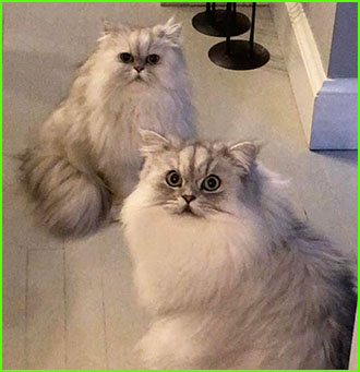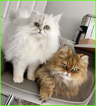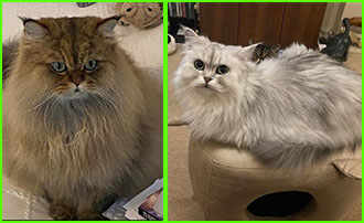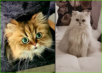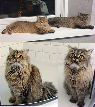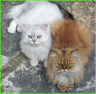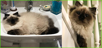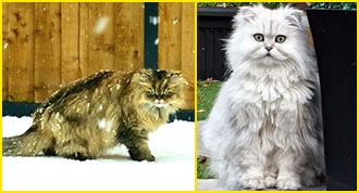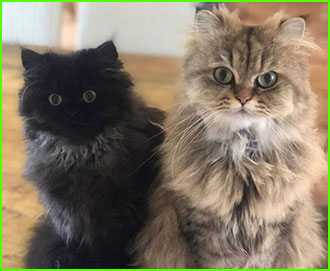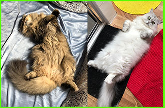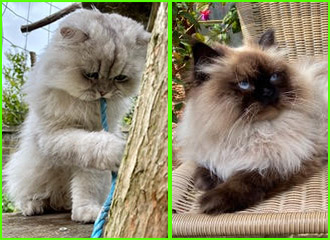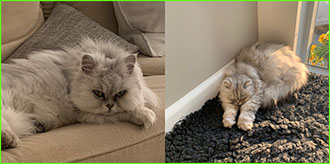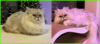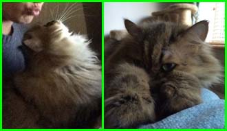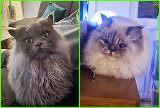 | Inge's Yogi and Luna: "I know I have told you this before but we really are so happy with our 2 feline friends. They are the most content pair and are so placid. They ve never scratched or swiped anyone even if we have to tackle a little knot in their fur. Luna may give a little warning hiss occasionally if she thinks you are brushing too hard but that s all. I think she s just making up for her lack of size. Yogi has quite different fur. Very silky. I call him my handsome boy."