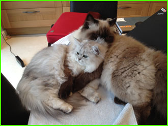 They are doing so well and give us such joy. Really funny, brave little characters and still great friends who always look out for each other. One, Sophie (Mary) loves our dog and the other, Molly (Sarah) terrorises and bullies him!!! Our boys Calum and Sean love the cats and the cats love them. They love to cuddle up and sleep together.
