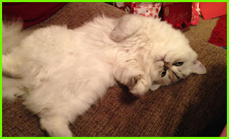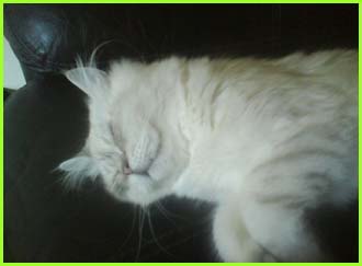'...I hope you are well. Snowball is five months old now and we thought you might like to know how he is getting on. As you can see from the photos attached he is growing into a very healthy, handsome cat. We absolutely adore Snowball, he s very playful and cheeky he likes to hide my make-up and hair ties and he enjoys playing hide and seek with Anthony J Snowball has made our home so happy and we are very grateful to you, Thank you'