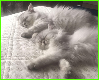 They are as naughty as ever (just how kittens should be). Cesare and Farrah sleep on my pillow, not much room for me, have a photo of this and will send you. Farrah is still extremely talkative which is nice, she meows while she purrs. Cesare has a tiny meow and Farrah meows enough for the two of them!!