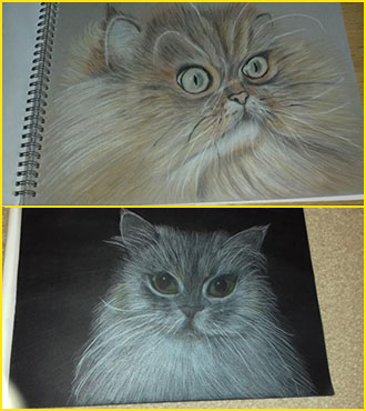 I will attach to this e-mail a couple of sketches I did of both of our cats for you to see. "