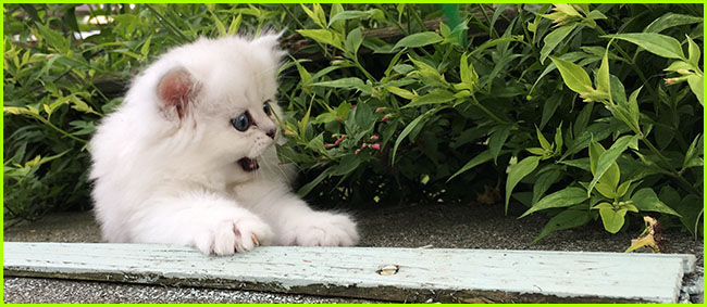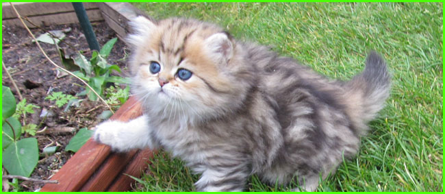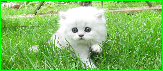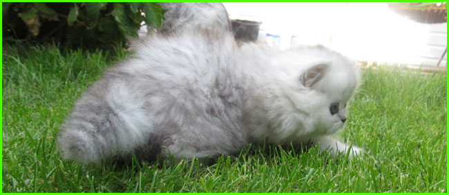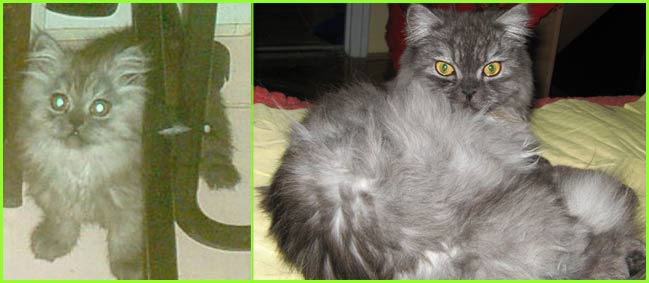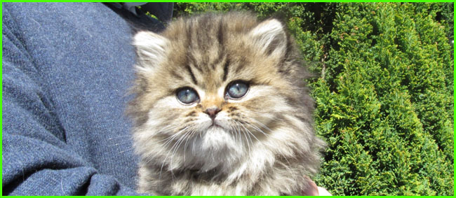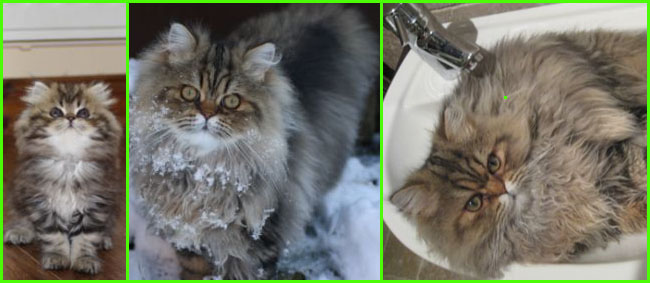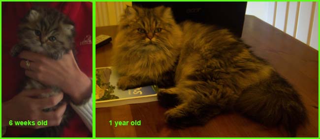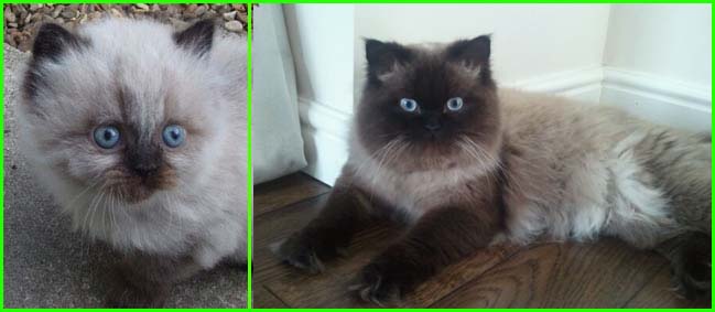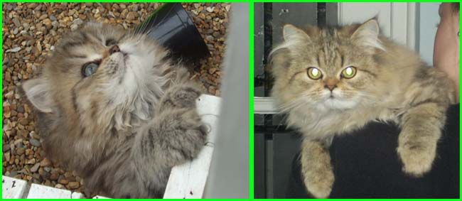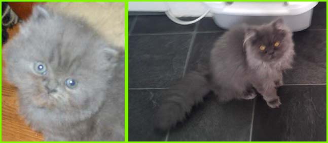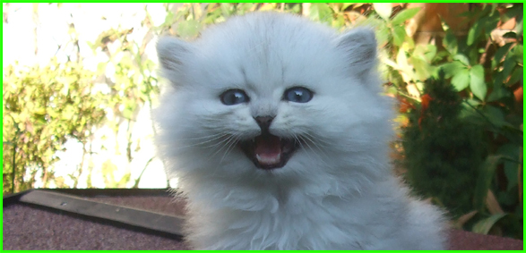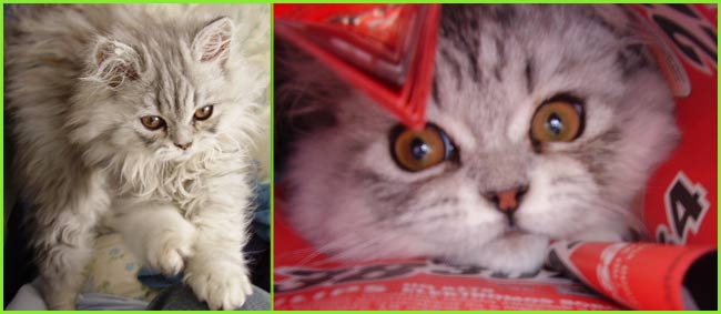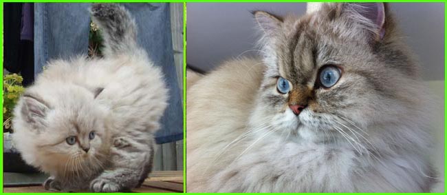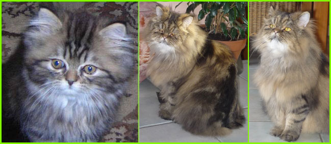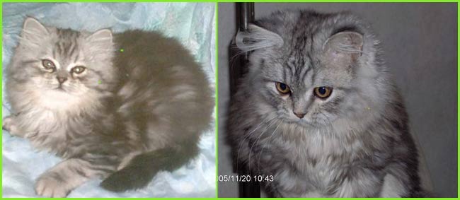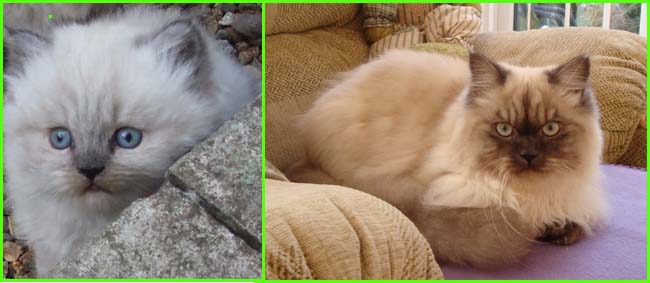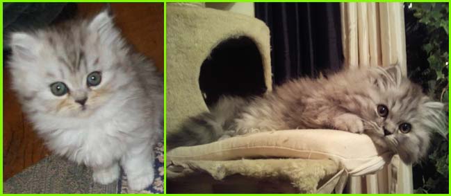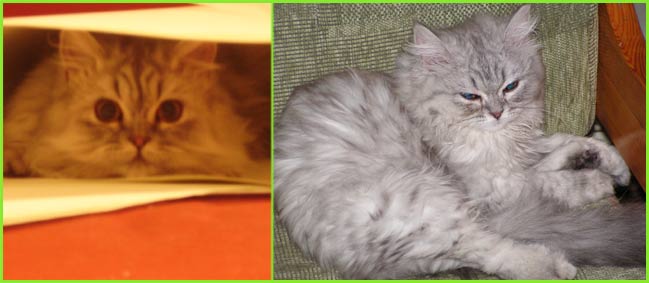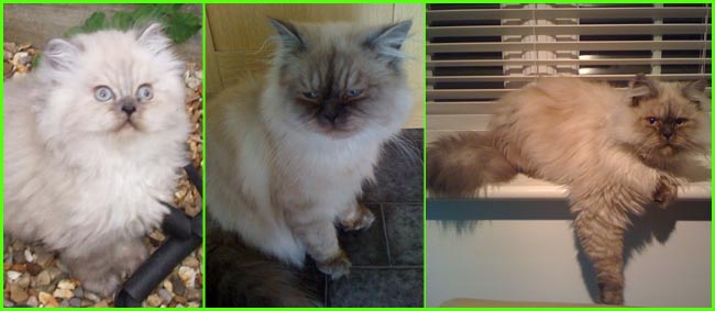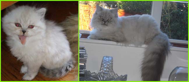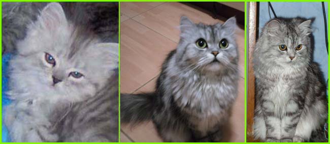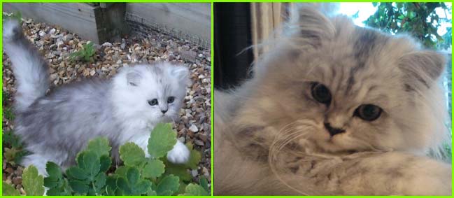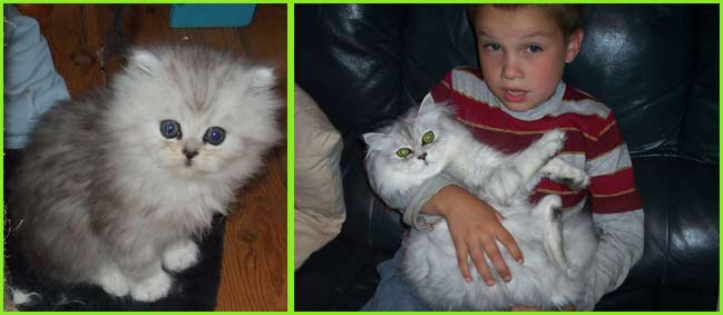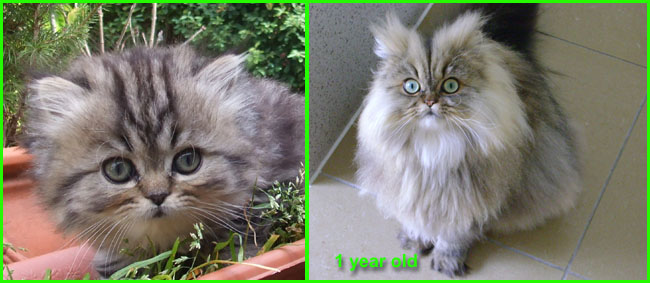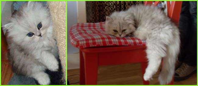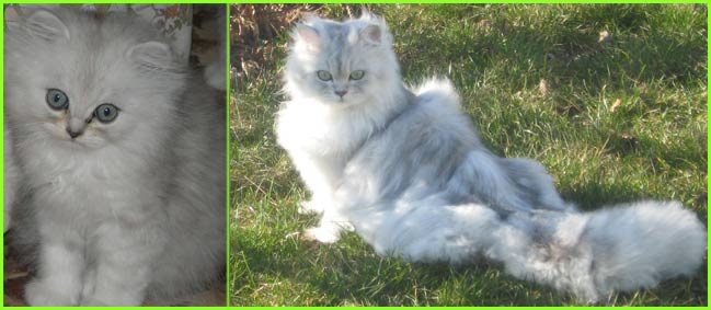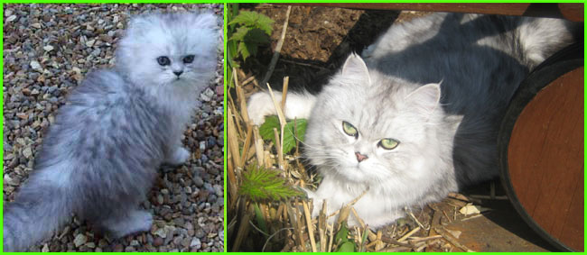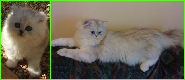 ICE - our beautiful, very young male cat His appereance was a co-incidence. His mother a beautiful silvershaded persian (Miu-Miu) and his father is Kismacs (below). He turned to be a chinchilla-himalayan 'cross' carrying both, chinchilla marks (lined nose) and himalayan marks (slightly darkened face as adult and blue eyes). RIP, we lost him due to a fatal dog bite.