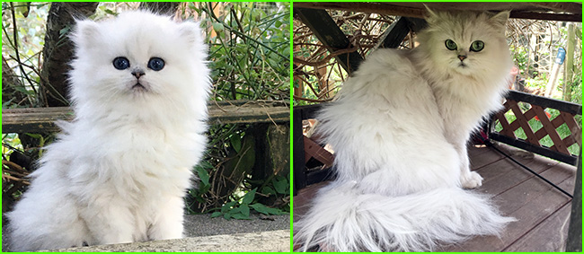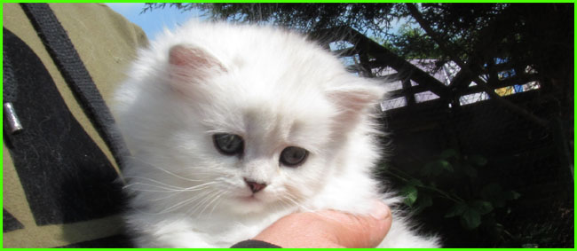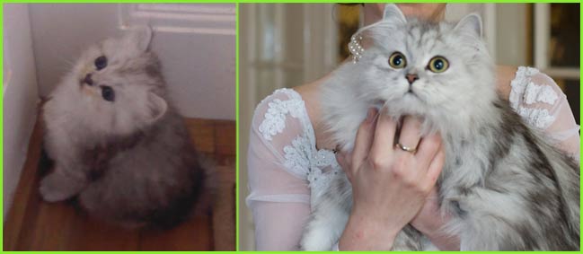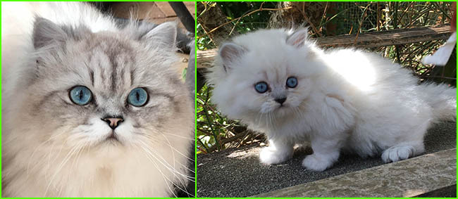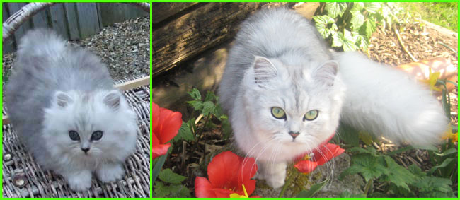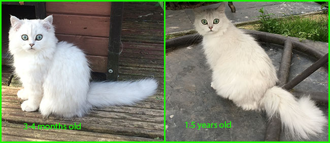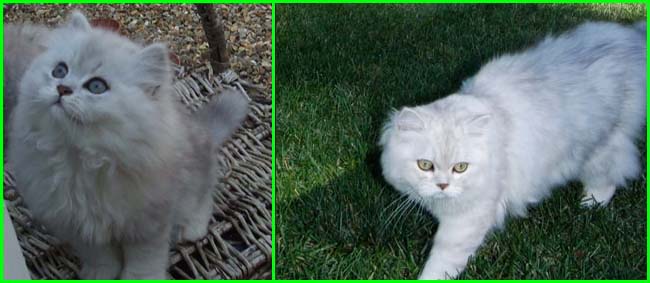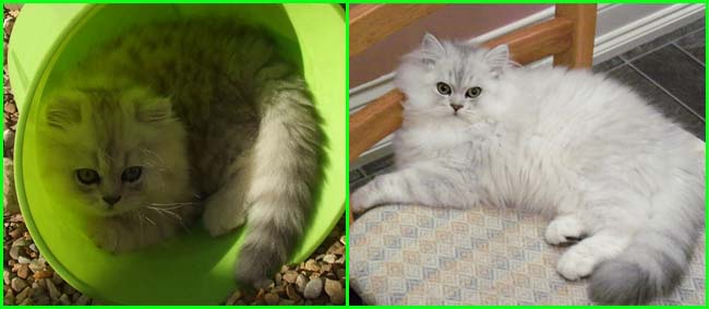 LittleChoosie (KisCs szi) she is a good examle of 'pure' chinchilla cat who does not carry gold gene: ancestors probably were not mixed in past with persians for shorter nose, ears, robust-looking body as this is what breeders often did, in this way they got short nosed "chinchillas" but as price of it, their gorgeous eye colour went to yellowish instead of pure green and fur colour went to less pure white but became silvershaded or a bit yellowish / pinkish and so on. Pure chinchillas in this days are very rare due to criss-crossing with persians to 'produce' the look what cat-shows preferred like very short noses and so on: colours of chinchilla on a persian body. But this is how they looked like and should look like in my opinion.
