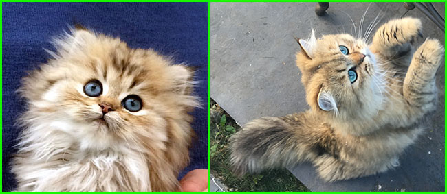 Kismacs - the shaded golden colour All of the shaded cats are much darker when kittens, when the fur is short because of the ratio of light coloured root and darker tipping (black, blue), later as their fur grows ratio will change and lighter part will be bigger, due to this the whole effect will be lighter. Kitten on the photo 8-9 weeks old (left), 5 months old (right), beautiful darkblue/grey shaded golden with gorgeous, rare eye colour (usually cats with this coloured fur has yellow or yellowish green eyes not blueish green / turquise)